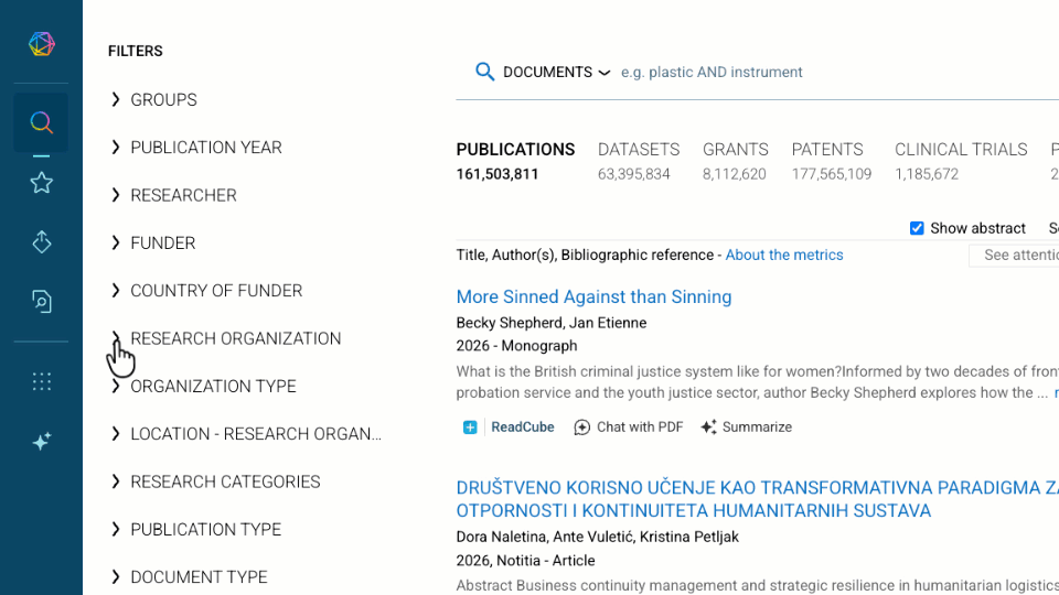 If you want to find only documents that have been authored by both organization 1 and organization 2, repeat the process shown in the above animation for each organization. This will then result in a so-called "AND" search between the organizations chosen, and only documents that feature all of the organizations requested will be returned in the search.