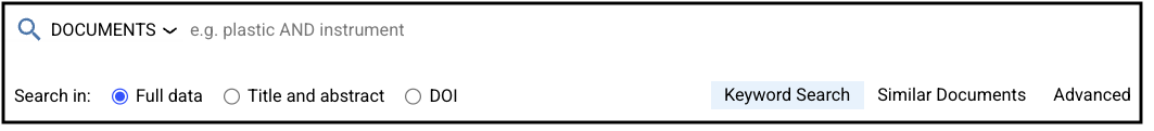 Using this method (formerly called "abstract search"), you can also search for documents which are similar to an abstract or other longer piece of text. Simply select "Similar Documents" on the right side of the search box, paste the text into the search box, and then press ENTER. Dimensions will then extract relevant concepts from the text and return the most similar documents. The similar documents search can be used with all available content types. It is therefore possible to request grants similar to a specific publication abstract, etc.