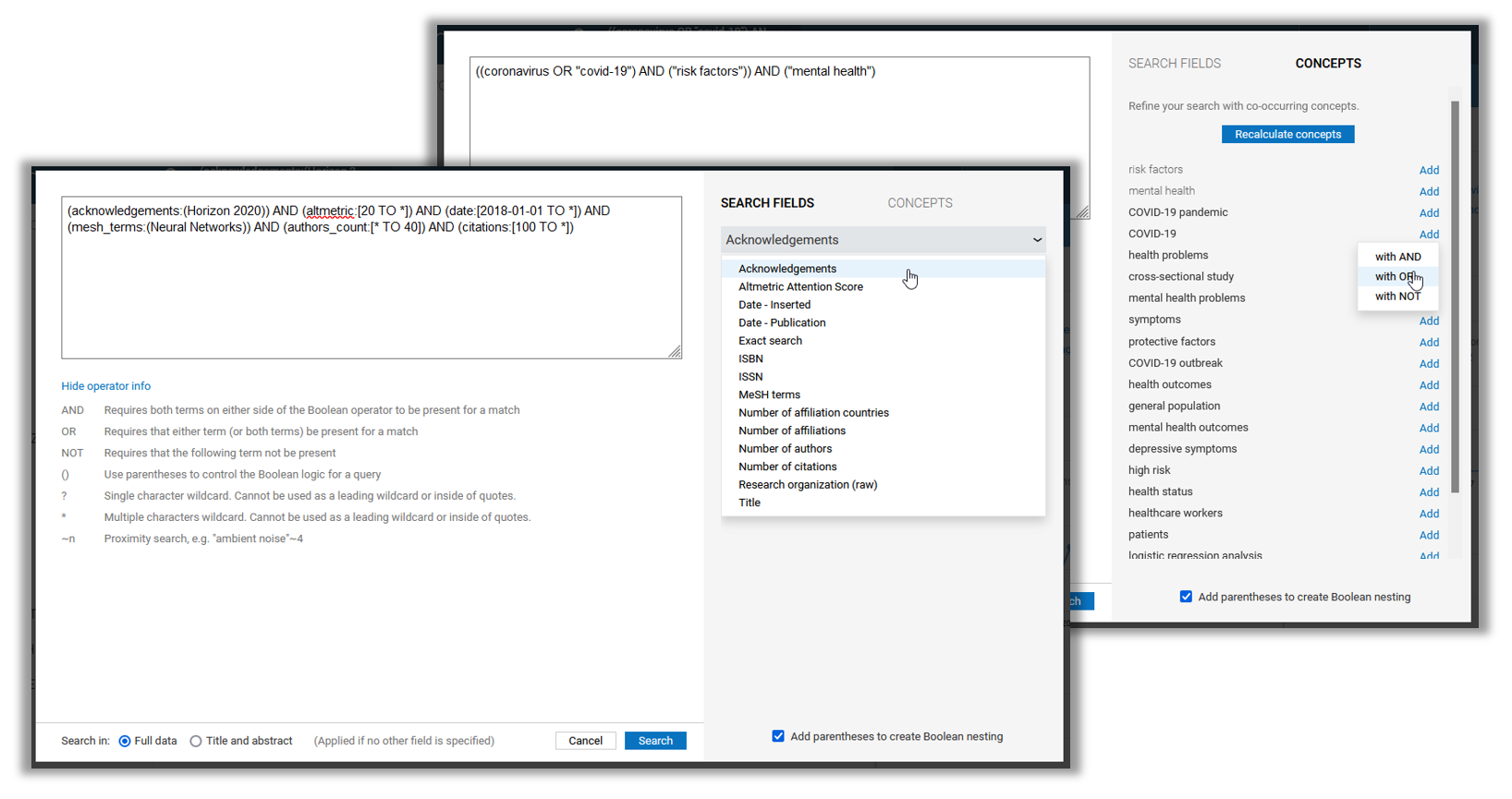 Selecting the "Advanced" option in the search box allows you to build more complex searches, either by searching within specific metadata fields, asking Dimensions to suggest terms and concepts co-occurring with the keywords you're looking for, or searching for a set of up to 25,000 identifiers. Read more about using the advanced search in Dimensions.