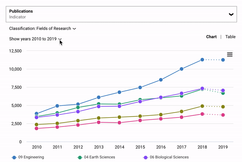 The timelineĀ visual displays the trend in the results for the last ten years, and new categories/funders etc. can be added or removed at the bottom.