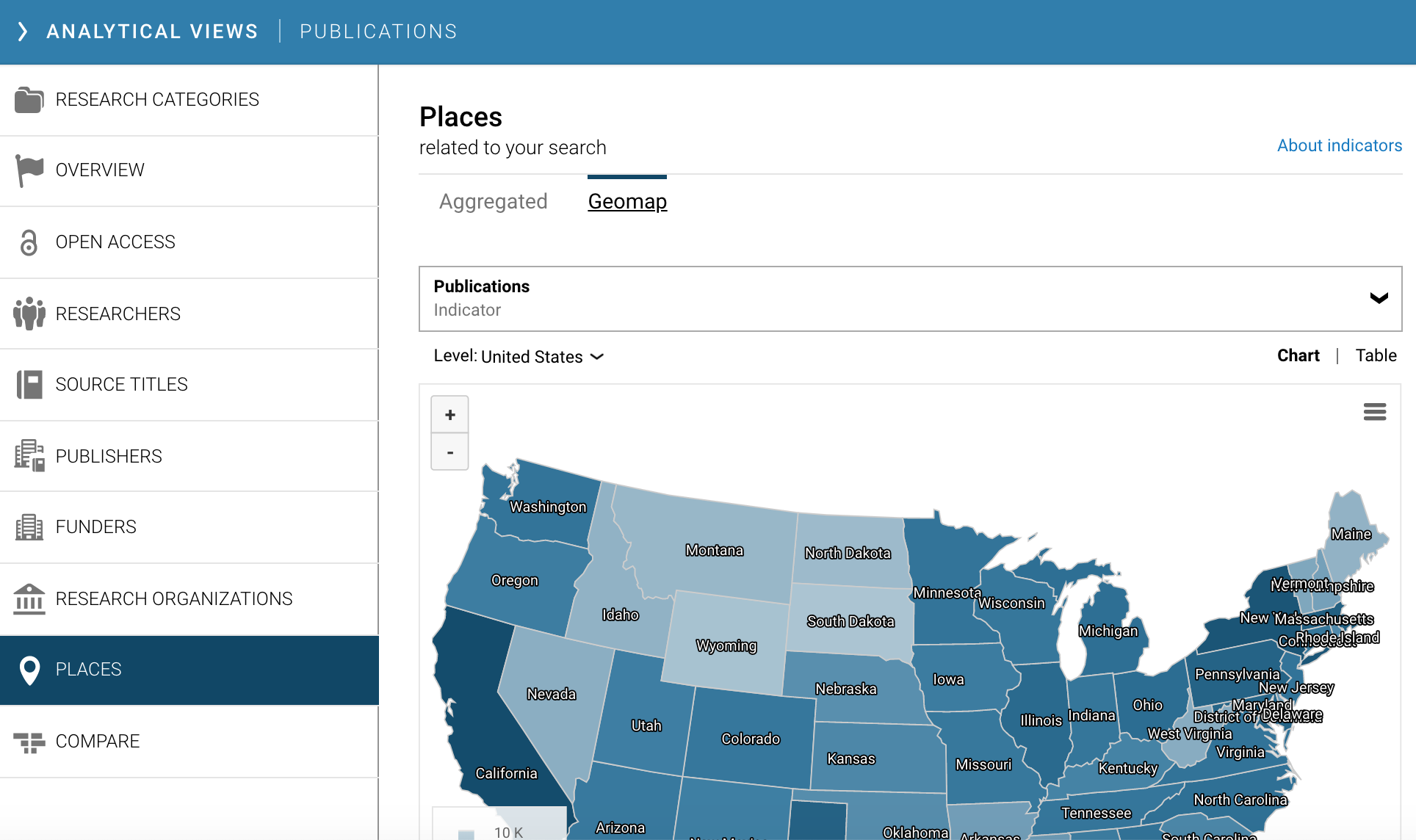 The geomap shows the geographical distribution of the results in a results list, and can be viewed on a global scale, or in Canada, USA and Australia on a state/territory basis.