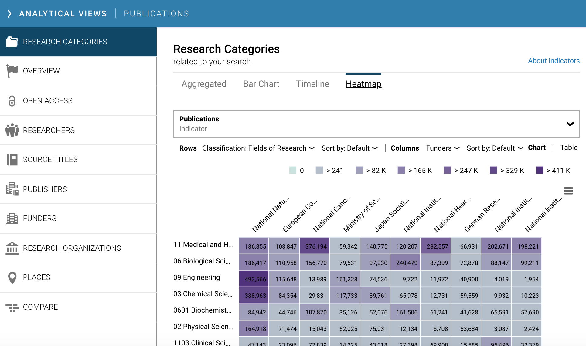 The heatmapĀ visual displays a grid of two different elements in a topic area, such as funder and research organisation, related to the area of the search.