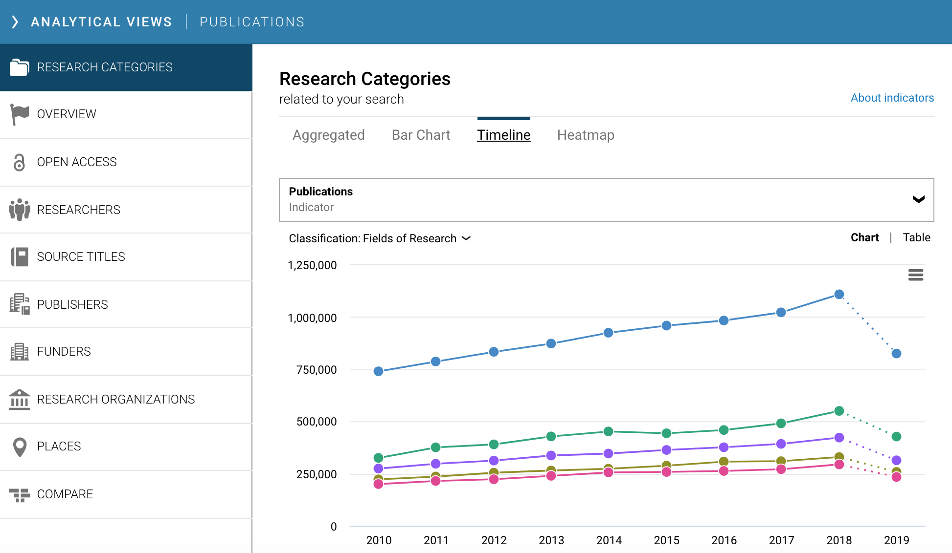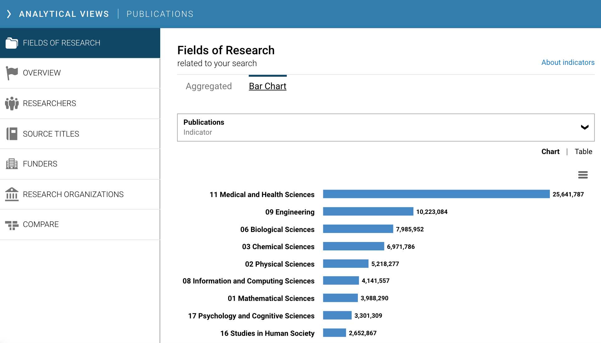 The bar chart visual displays the number of results for each research category using the Fields of Research (FoR) classification system (and others, in Dimensions Analytics only). Clicking on the displayed top-level FoR group will then produce the lower level 4-digit FoR classifications.