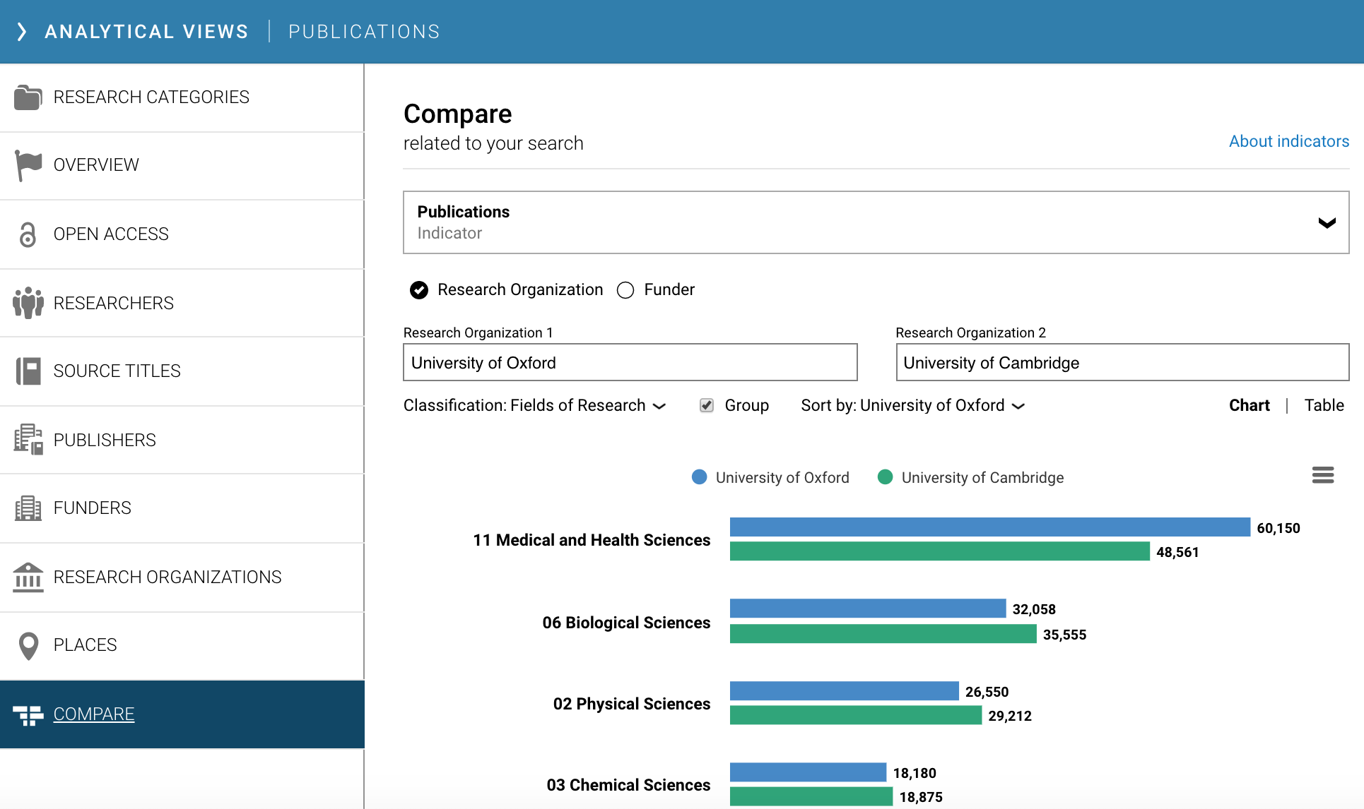 The compare function shows a direct comparison between two research organizations or funders across one of the standard classification systems, restricted to just the results from the search.