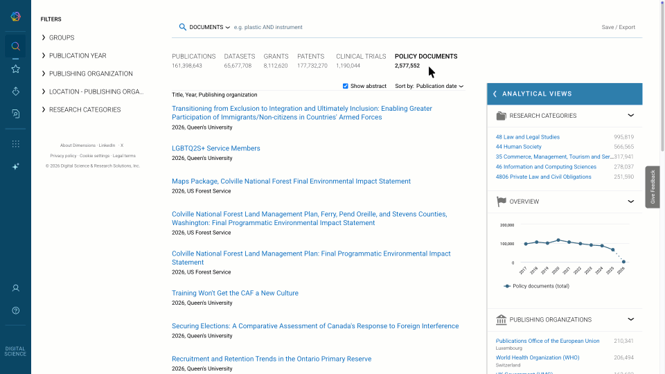 The policy document data includes sources that are designed to change or otherwise influence guidelines, policy or practice. (Please note, the Policy Document data source is not searchable in the free Dimensions version).