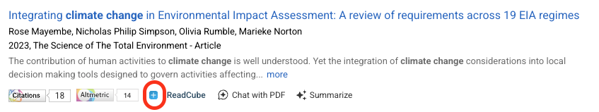 You can easily add items from the search results list to your Papers Library by clicking on the "ReadCube" button directly underneath a record: